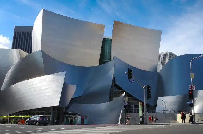 外部採用啞光不鏽鋼,表面光滑且富有張力,被設計成一系列相互重疊、像帆船又像褶皺緞帶的體量。更重要的是,它內部擁有被譽為全球頂尖的聲學設計,保證了極致的聽覺體驗。它的外觀優雅而戲劇化,讓所有路過的人都忍不住停下來拍照。它成功地將音樂殿堂的藝術性與洛杉磯的現代活力完美結合。